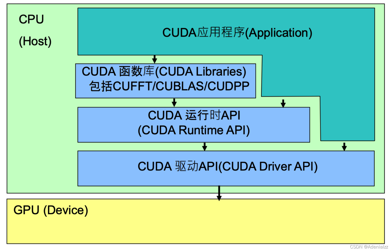 应用程序可调用CUDA Libraries或者CUDA Runtime API来实现功能,当调用CUDA Libraries时,CUDA Libraries会调用相应的CUDA Runtime API,CUDA Runtime API再调用CUDA Driver API,CUDA Driver API再操作GPU设备。