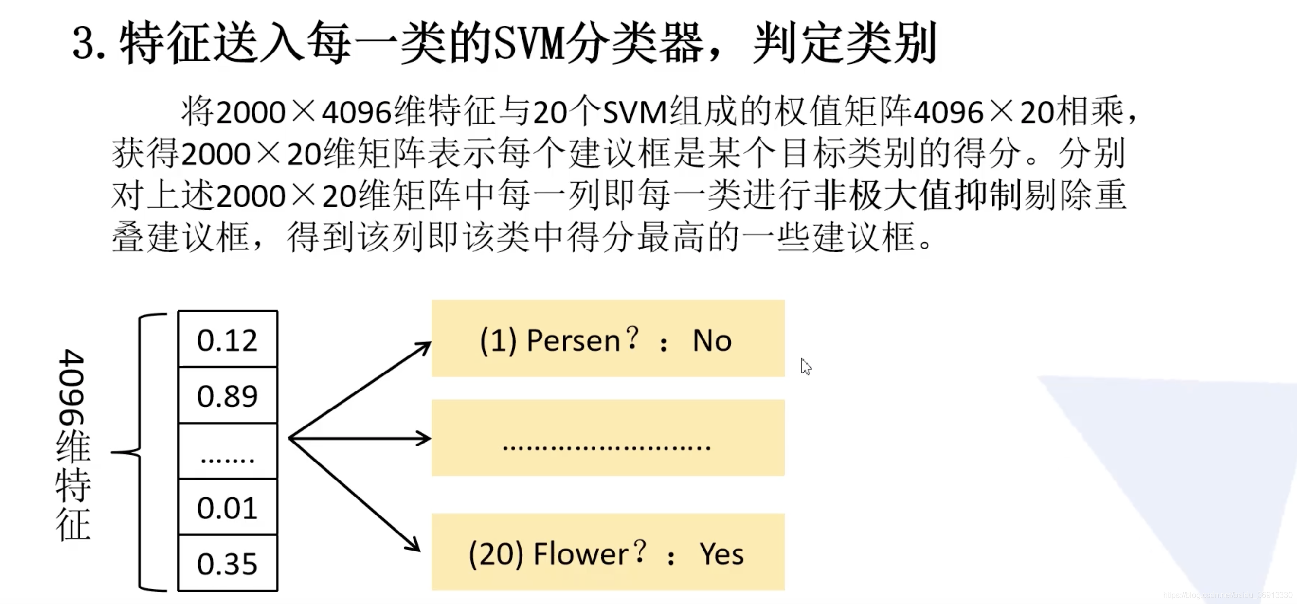 将得到 2000×4096 维特征与20个(数据集是20分类的)SVM组成的权值矩阵 4096×20 相乘,获得 2000×20 维矩阵表示每个建议框是某个类别的得分。对上述 2000×20 维矩阵中每一列即每一类进行非极大值抑制剔除重叠建议框,得到该列即该类中得分最高的一些建议框。