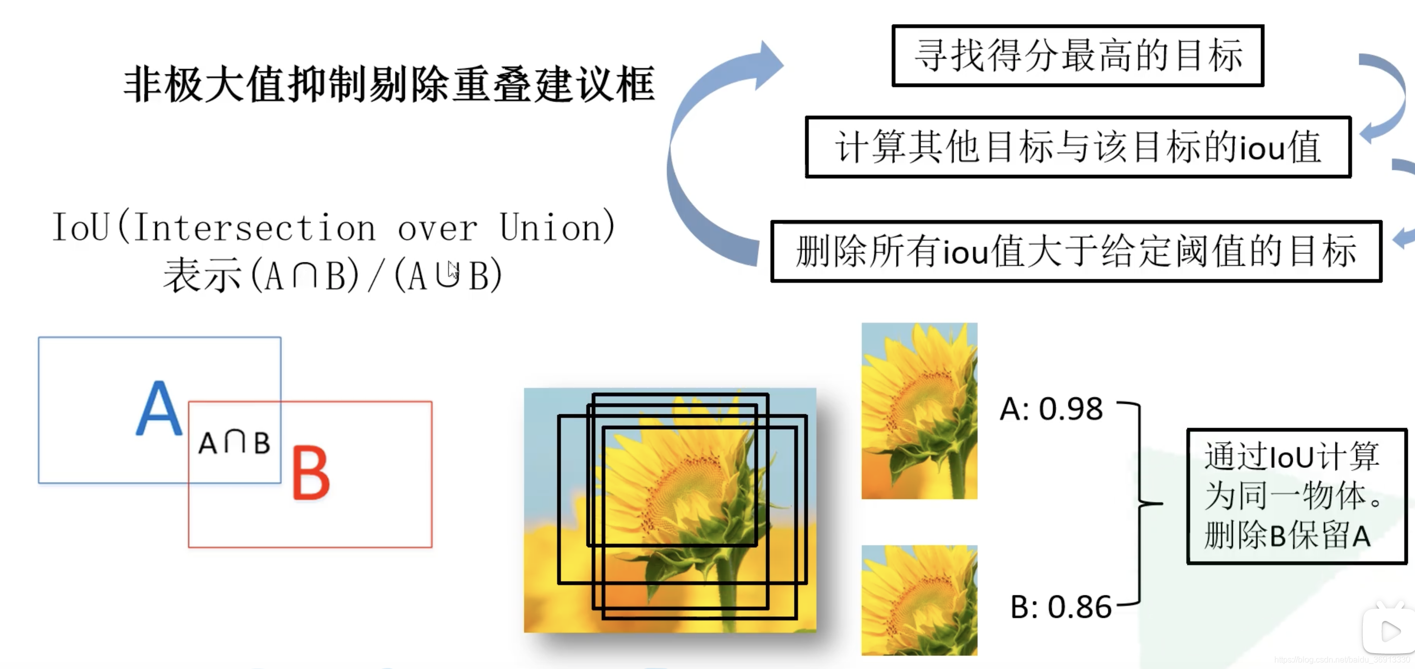 对 2000×20 维矩阵中每一列即每一类进行非极大值抑制,则可以剔除重叠建议框,保留高质量的建议框!