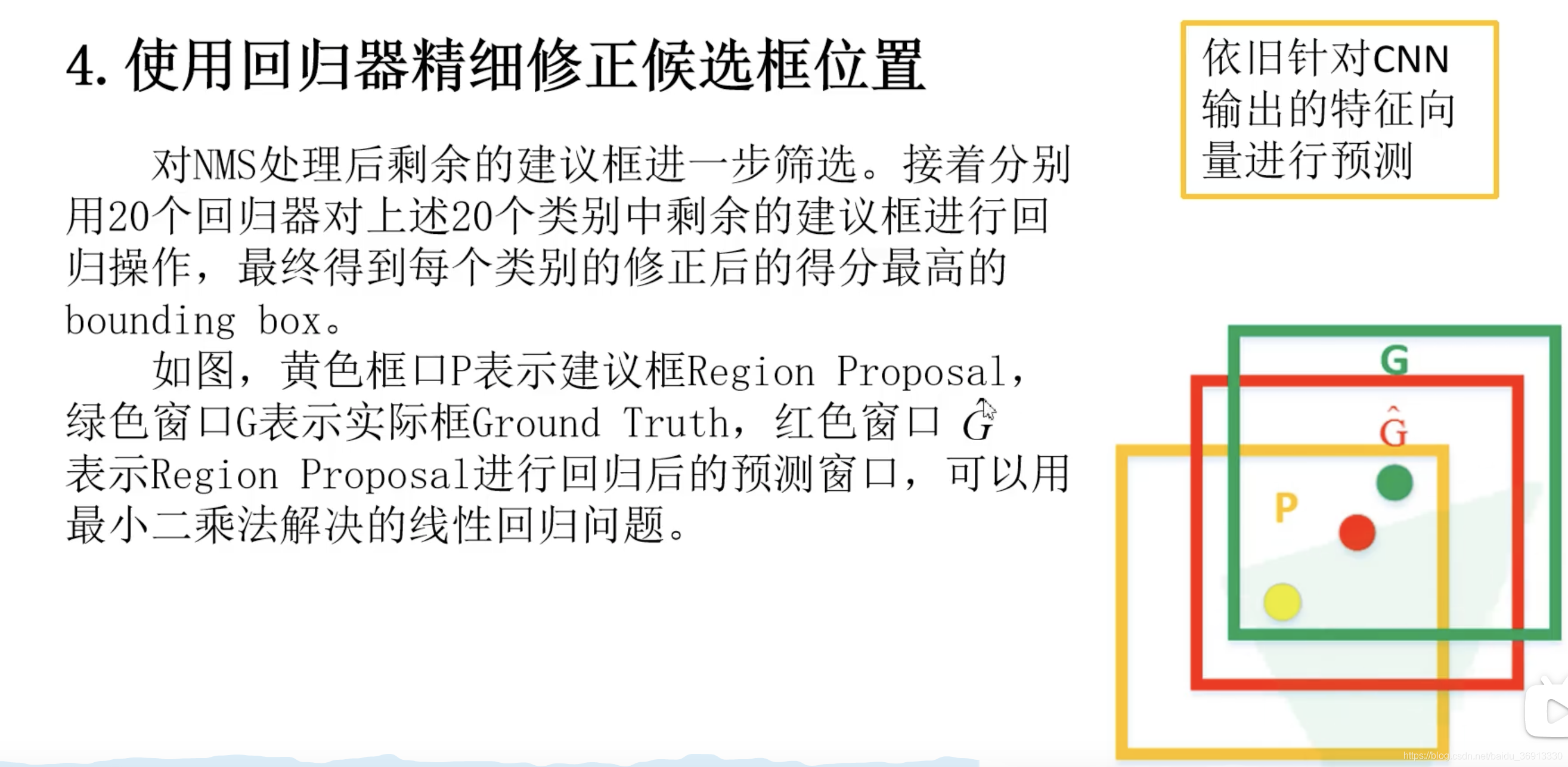 对 NMS(非极大值抑制)处理后剩余的建议框进行进一步筛选。接着分别用 20 个回归器对上述 20 个类别中剩余的建议框进行回归操作,最终得到每个类别的修正后的得分最高的 bounding box。回归器得到四个值:x和y方向的偏移量,高度和宽度的缩放值。 回归器的具体训练方法在这里就没讲了,在讲Faster-RCNN的时候会进行讲解。我想应该是有预测框,有ground-truth然后训练得到的。