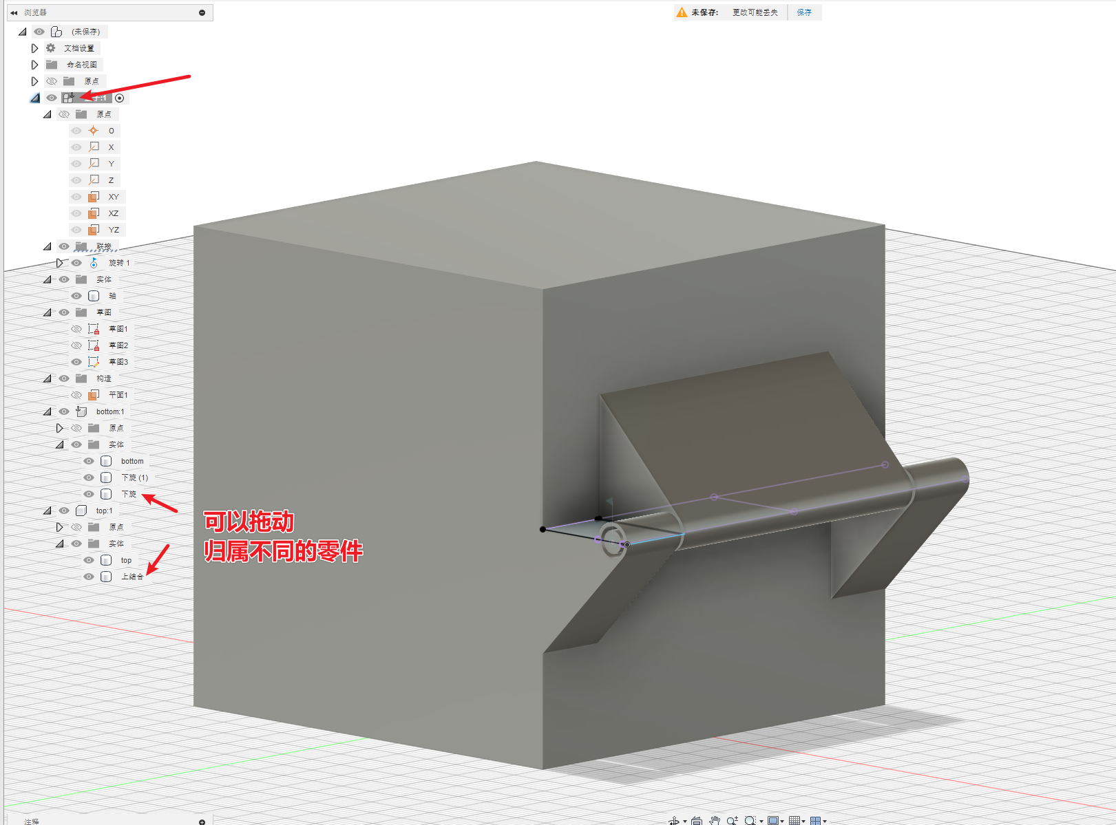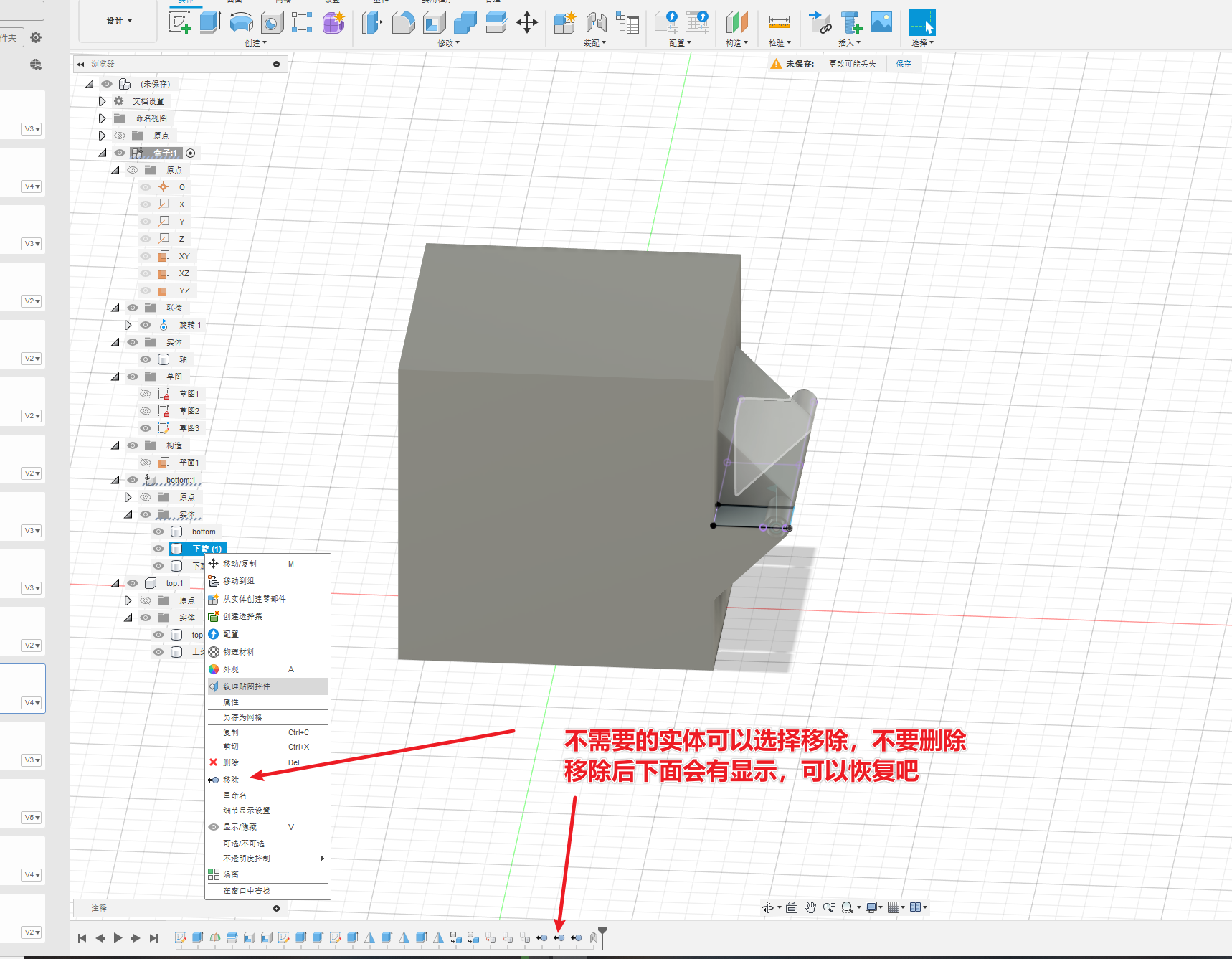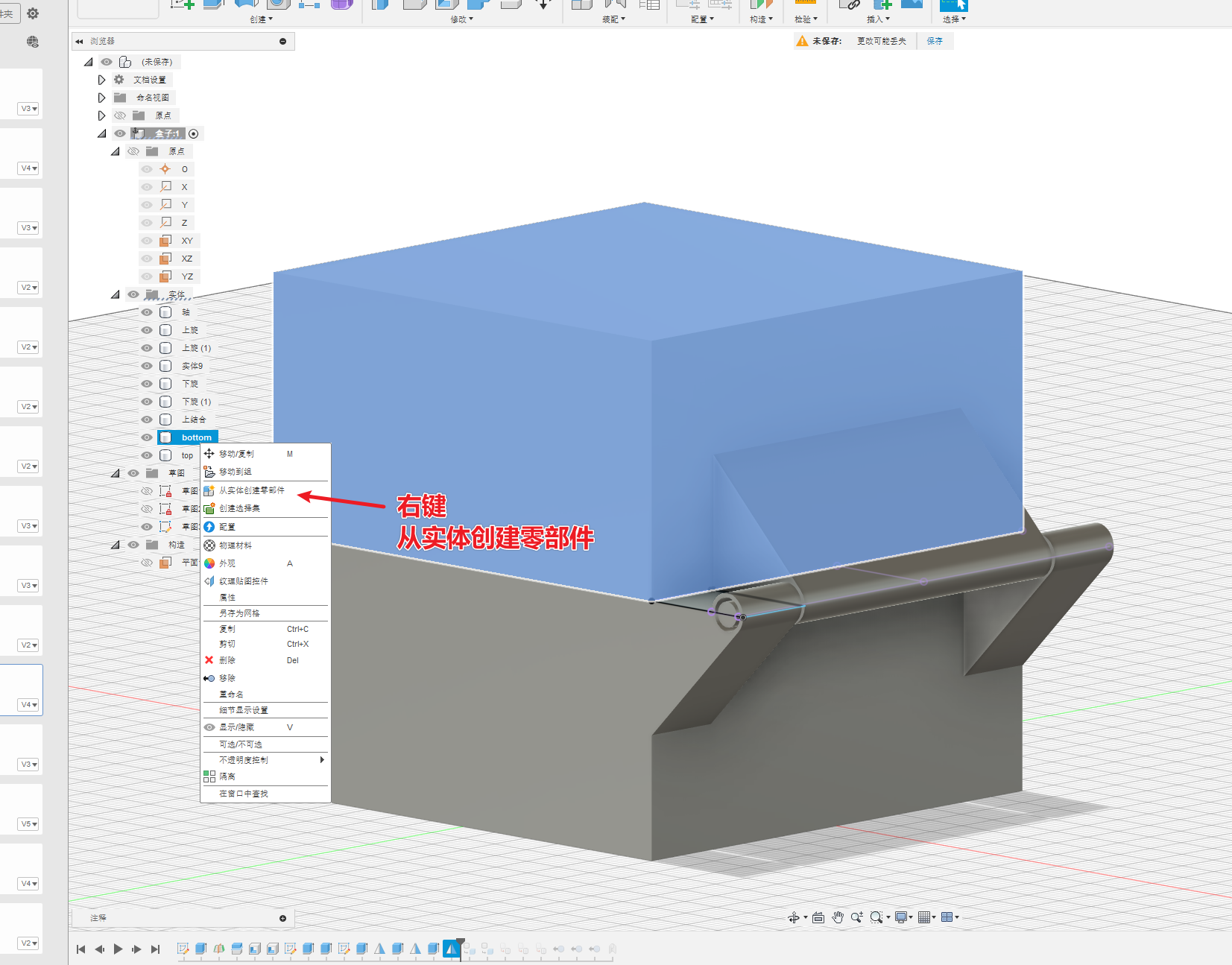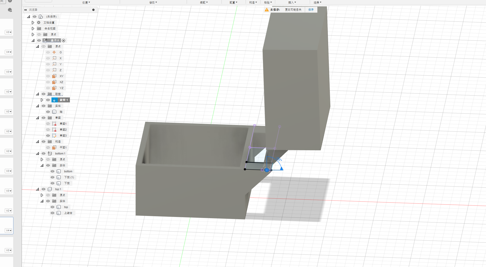 Day17-盒子 发表于 2025-05-25 分类于 Fusion 360 阅读次数: 简介根据B站的视频30天学会fusion 360 .这里针对每一个图纸的重点做一个记录。 参考https://www.bilibili.com/video/BV1UL4y177r8?spm_id_from=333.788.videopod.sections&vd_source=cde2e7b9bca1a7048a13eaf0b48210b6 同样只记录之前没有学到的问题 盒子 修改-分割实体:将一个实体分为两个 从实体创建零部件:创建零部件是为了区分上下盒子是不同的零件。不同的零件才能做联接动画 实体可以有多个零件组成 实体-移除:可以不删除,但是移除实体 修改-分割实体 从实体创建零件 实体-移除 成品图