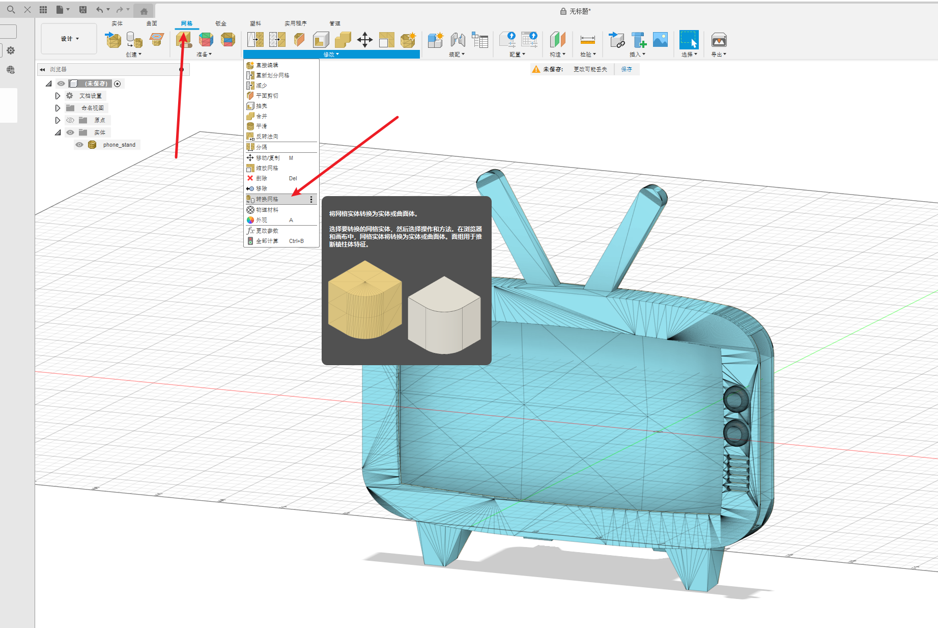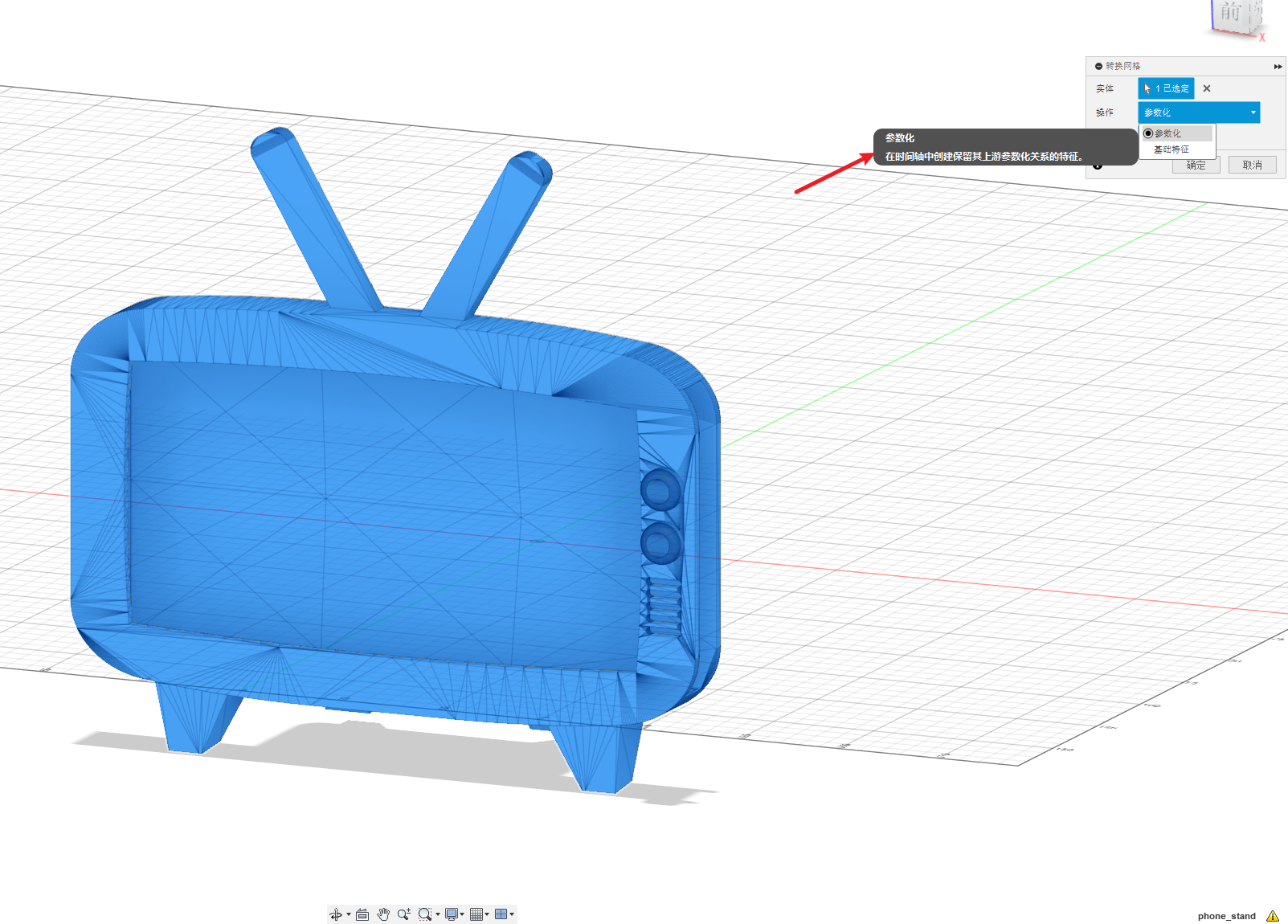 假如网上有一个我们需要的stl文件,但是需要我们导入到fusion 360中进行修改编辑,是不能直接编辑的,因为是网状的文件.需要转换为一个实心的。