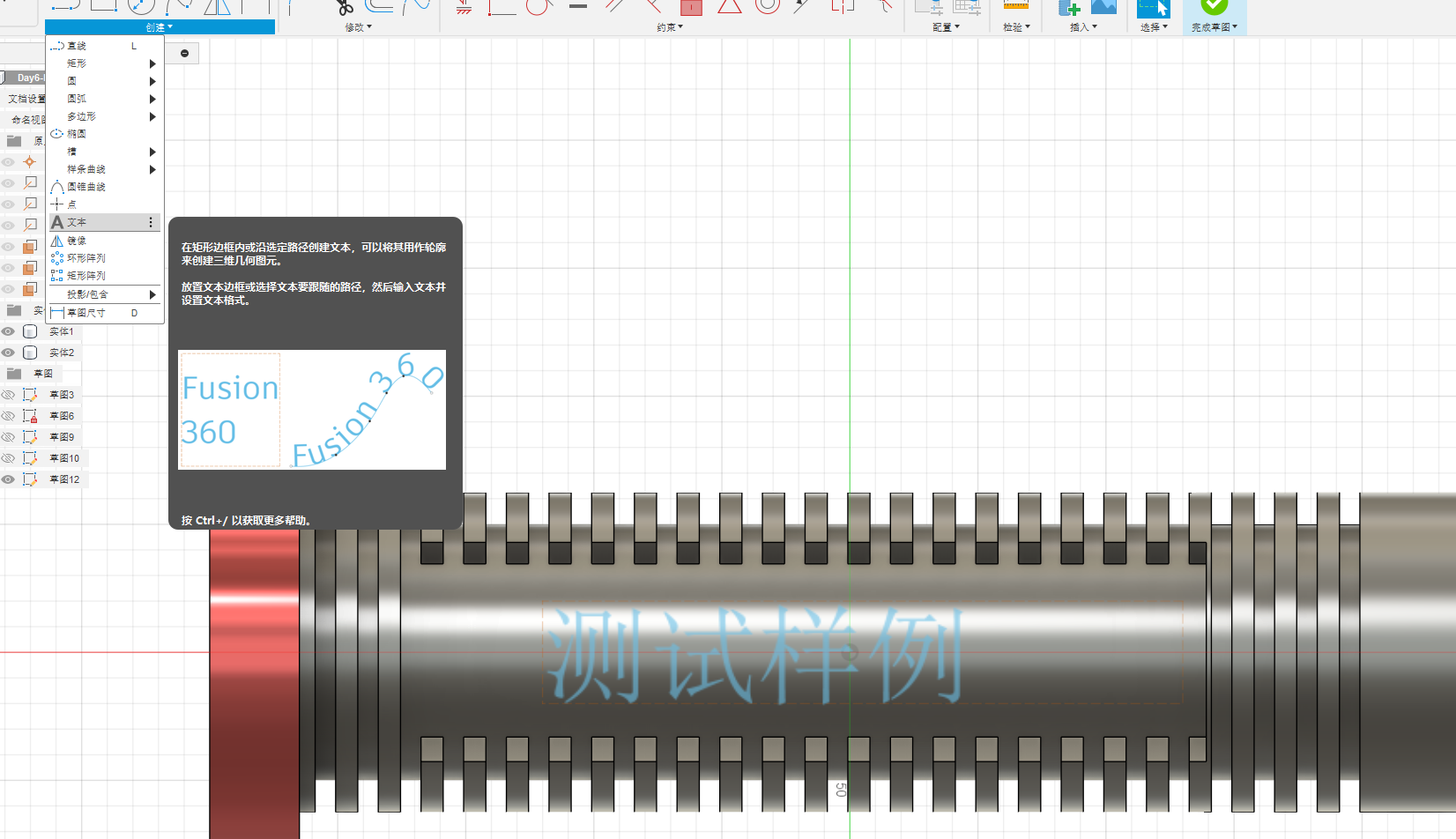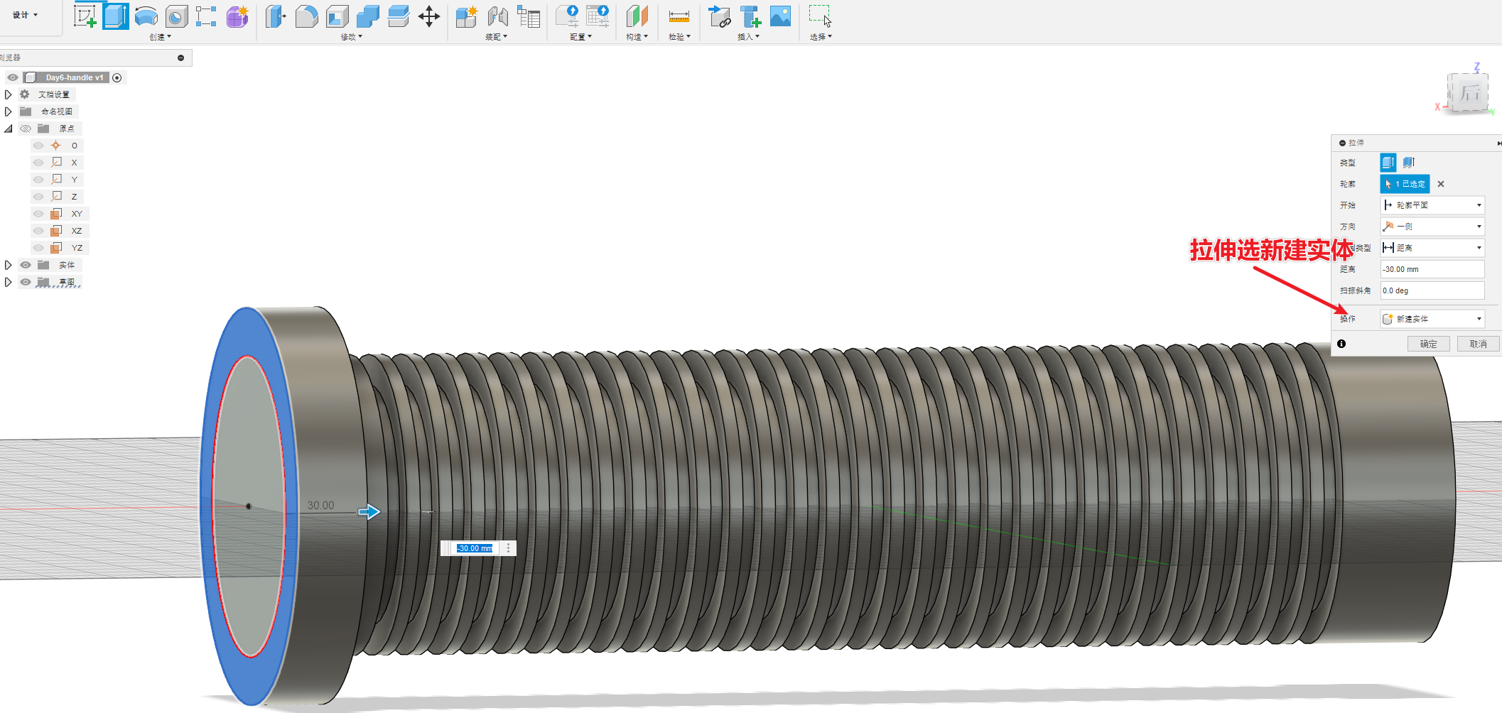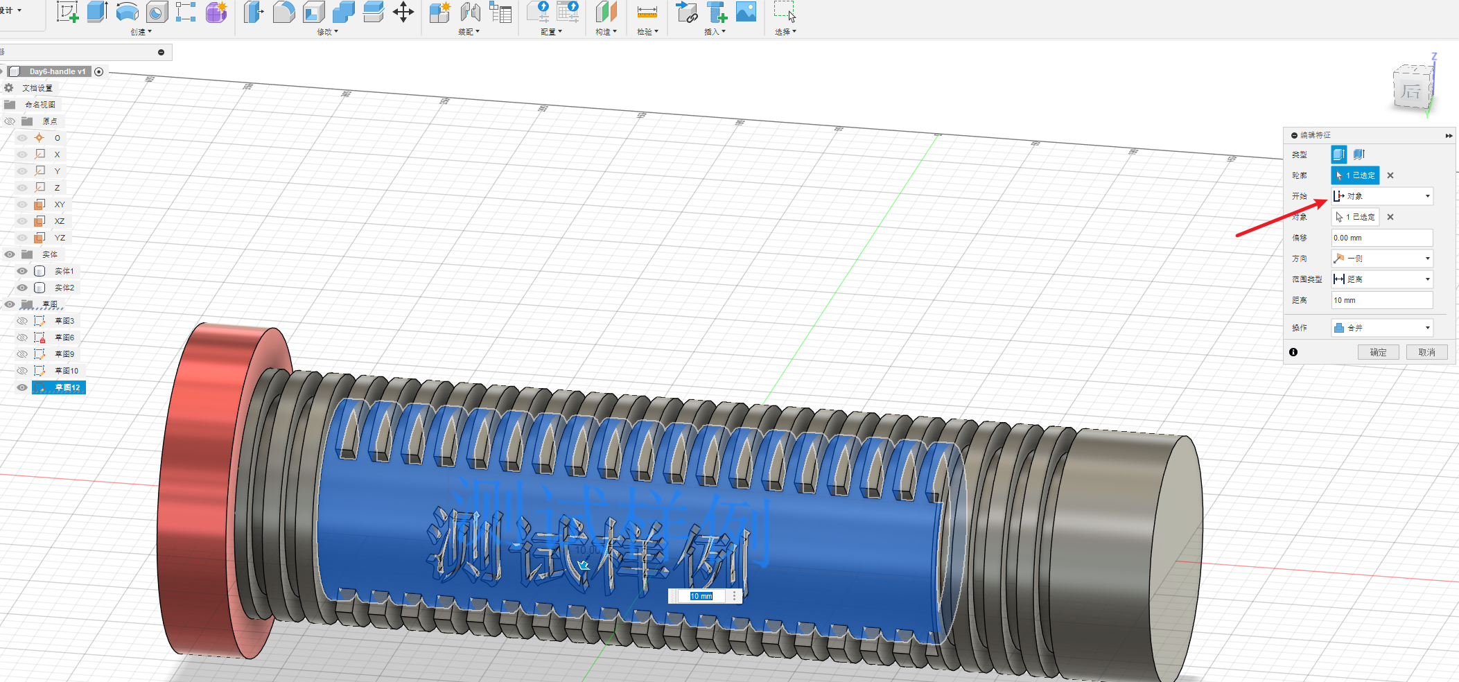 Day6-橡胶车把 发表于 2025-05-17 更新于 2025-05-18 分类于 Fusion 360 阅读次数: 简介根据B站的视频30天学会fusion 360 .这里针对每一个图纸的重点做一个记录。 参考https://www.bilibili.com/video/BV1UL4y177r8?spm_id_from=333.788.videopod.sections&vd_source=cde2e7b9bca1a7048a13eaf0b48210b6 橡胶把手重点步骤 多实体 表面纹路 文字 矩形阵列,选小矩形的四条边 旋转 新建实体这样可以区分为两部分材质 切割部分出来,为了显示文字 创建文本 拉伸,选择对象 成品图