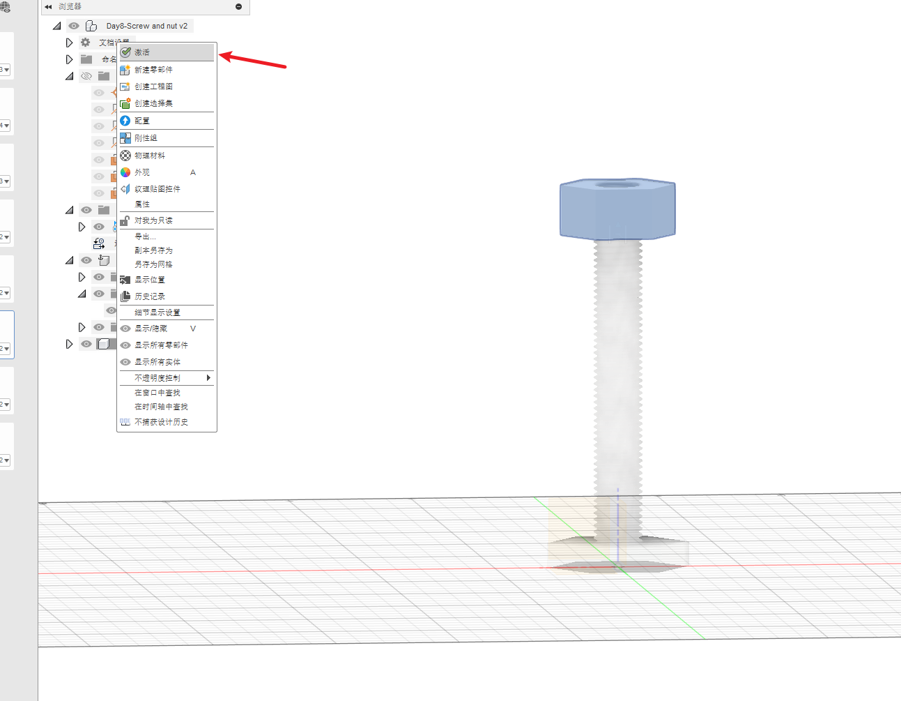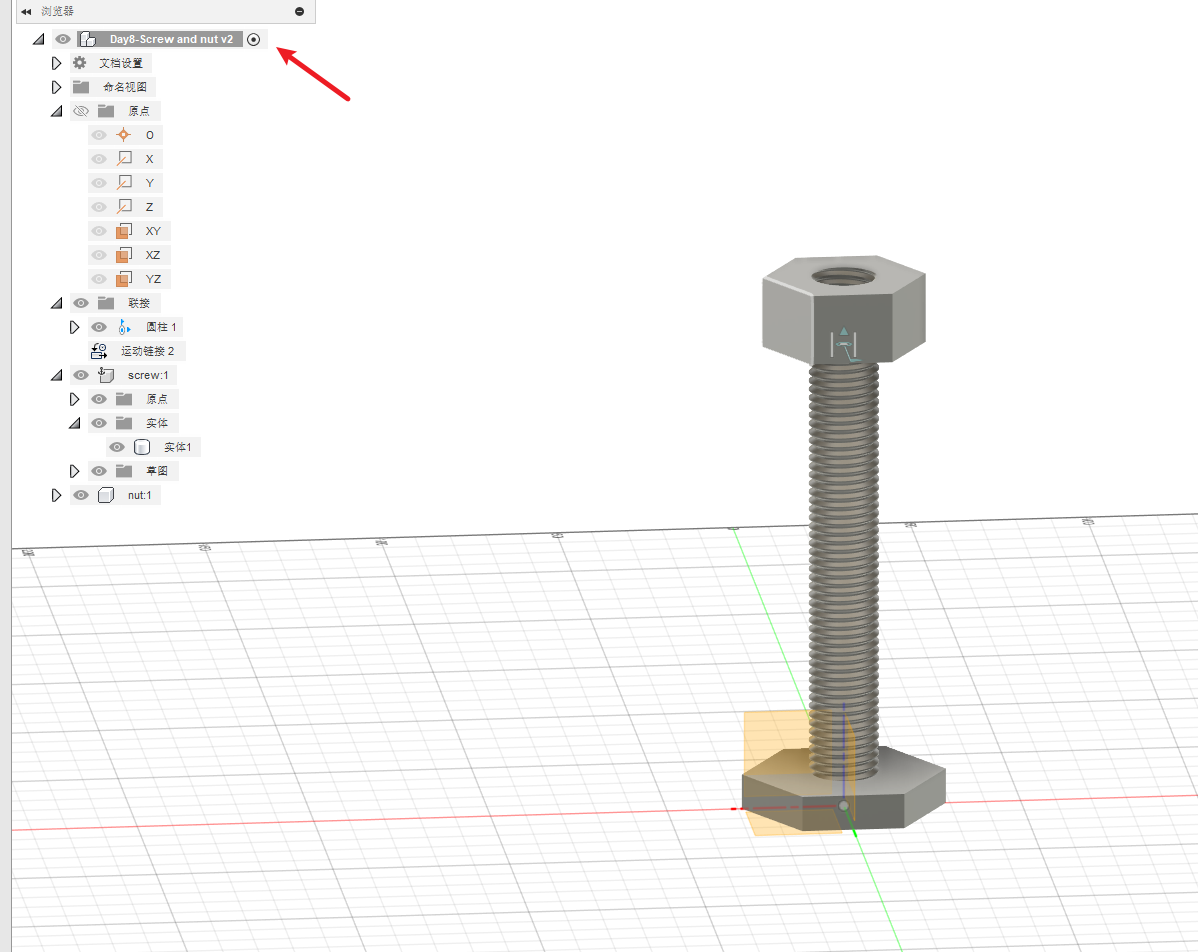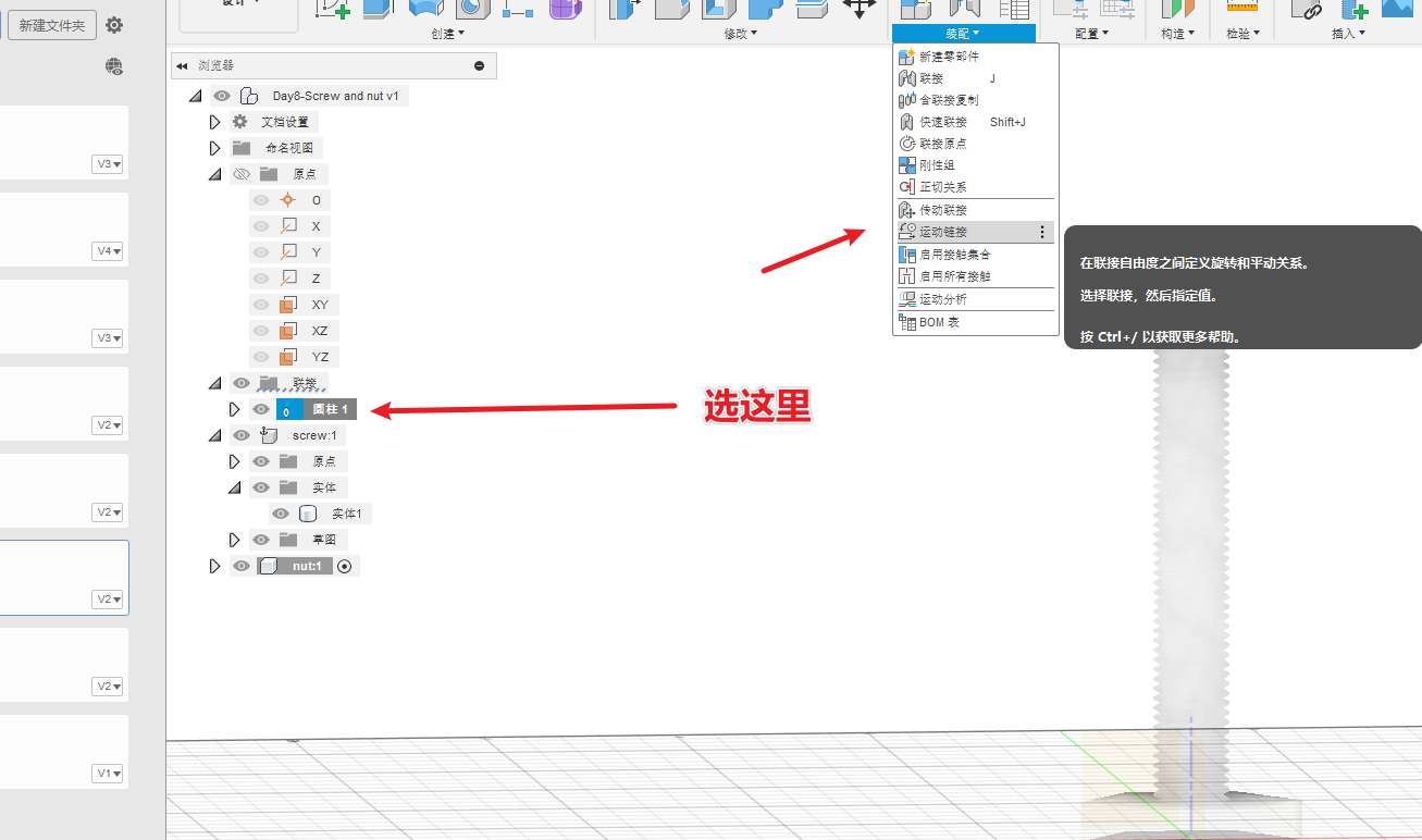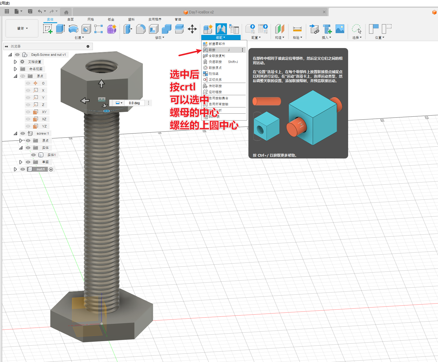 Day8-螺丝螺纹动画 发表于 2025-05-18 分类于 Fusion 360 阅读次数: 简介根据B站的视频30天学会fusion 360 .这里针对每一个图纸的重点做一个记录。 参考https://www.bilibili.com/video/BV1UL4y177r8?spm_id_from=333.788.videopod.sections&vd_source=cde2e7b9bca1a7048a13eaf0b48210b6 螺丝螺帽创建一个螺丝和螺帽,添加动画效果 重点步骤 创建-圆柱体 新建零部件 激活 装配-链接 装配-运动链接 新建零部件 创建-圆柱体 下面开始创建一个螺帽新建零部件 激活 链接 运动链接 激活两个零部件 成品图