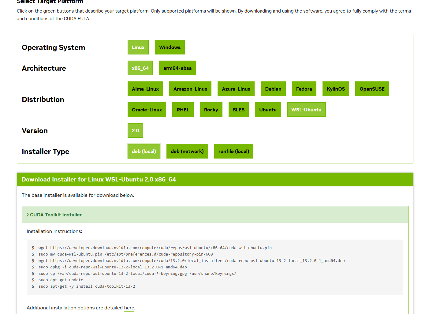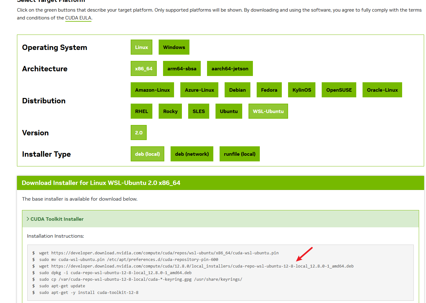 在nvidia官方连接 按照下图及指令在wsl中输入即可。这里可以看到默认下载的cuda是最新的版本,可以看一下自己的显卡支持什么版本进行选择下载。