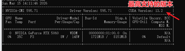 在windows终端中输入nvidia-smi,查看支持的最高的版本,我们安装的wsl中的cuda小于等于这个版本即可